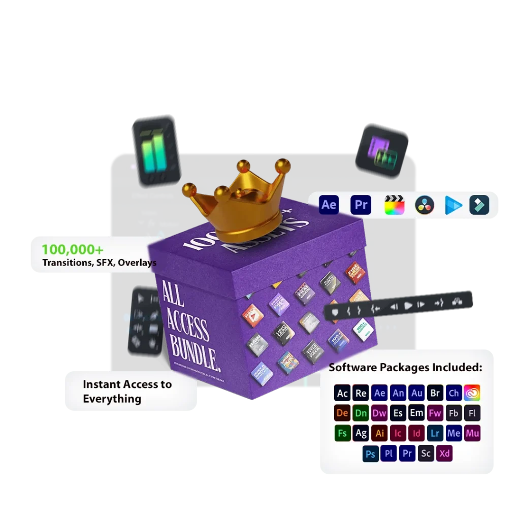 Get over 70 GB of video editing assets, including transitions, overlays, fonts, LUTs, FX, premade templates, and premium software like Premiere Pro, After Effects, and six additional Adobe products. On top of that, get a full-fledged video editing course to get you started.